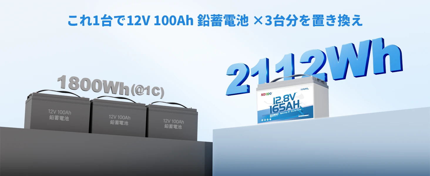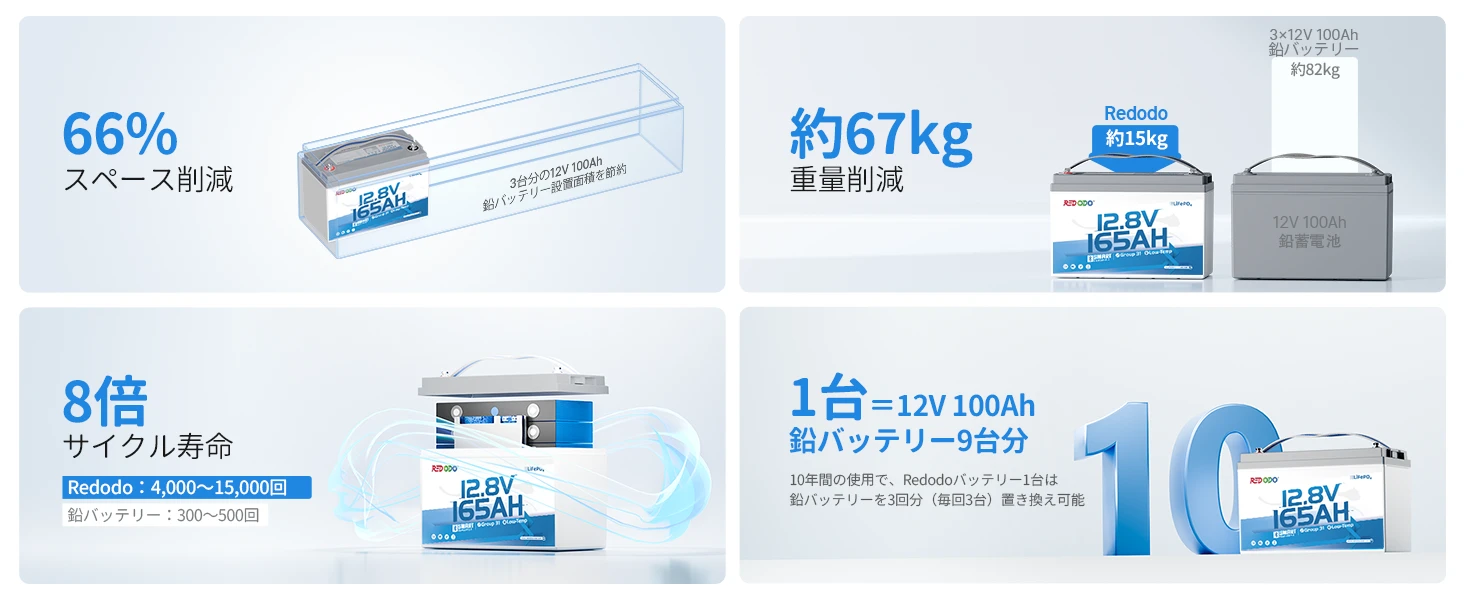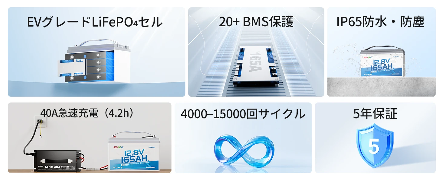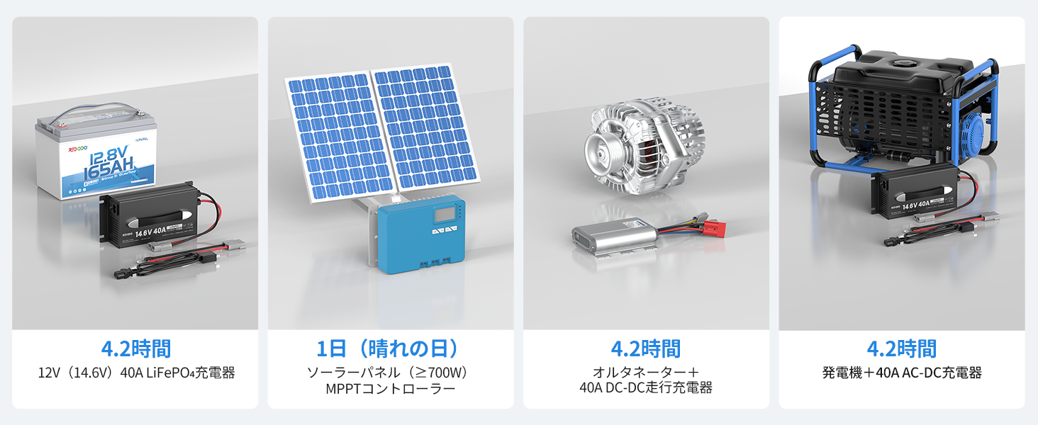 バッテリーはLiFePO4バッテリー充電器で充電できます。Redodo 12V 20A バッテリー充電器で約8.3時間、Redodo 12V 40A バッテリー充電器で約4.2時間でフル充電できます。また、MPPTソーラーチャージコントローラー付きソーラーパネル、オルタネーター、発電機でも充電できます。具体的な充電方法は製品マニュアルをご覧ください。